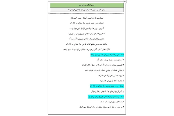 روش تدریس درس هشتم فارسی اول ابتدایی دريا اردک