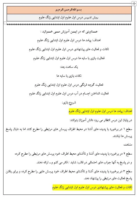 روش تدریس درس اول علوم اول ابتدایی زنگ علوم