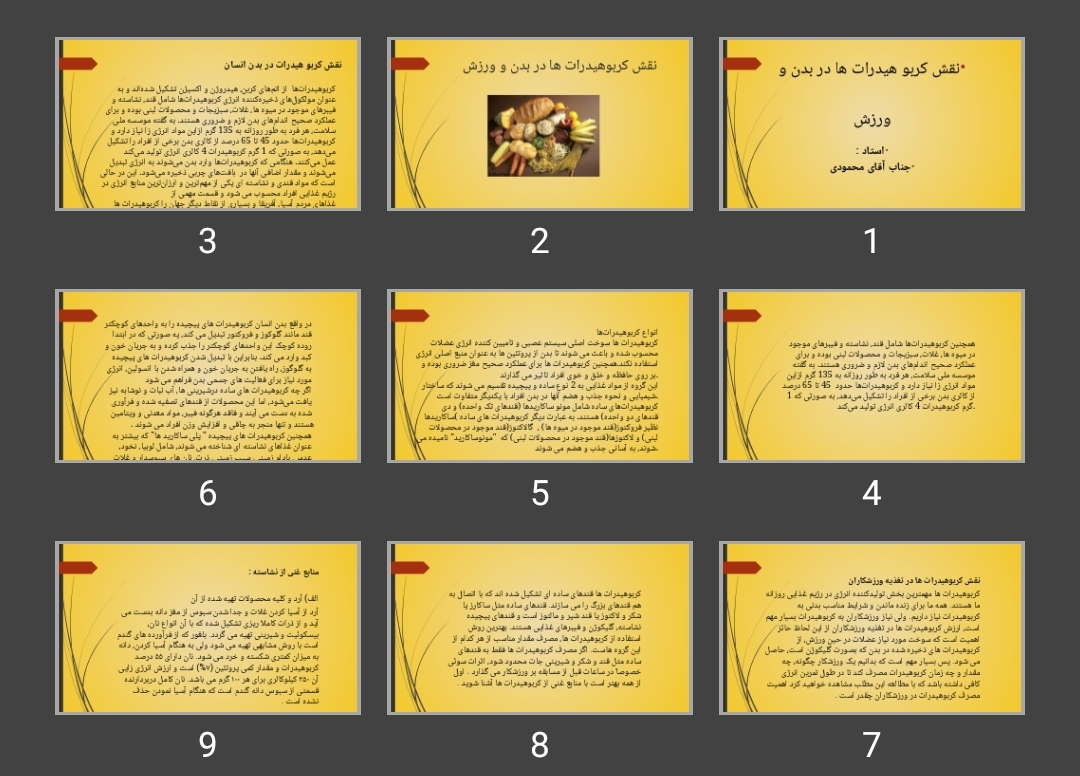 مشخصات فایل: پاورپوینت نقش کربو هیدرات ها در بدن و ورزش تعداد صفحات ۲۰ فایل پاورپوینت pptx می باشد. تعدادی از اسلایدهای ابتدایی با کیفیت بهتر جهت مشاهده درج شده است.