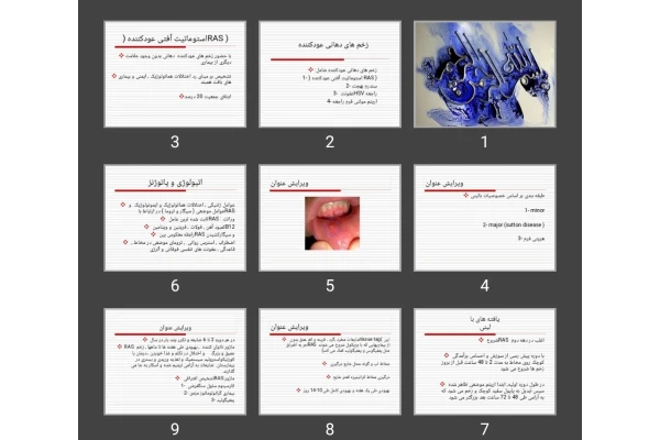مشخصات فایل: پاورپوینت زخم های دهانی عودکننده تعداد صفحات: ۲۱ فایل پاورپوینت ppt می باشد. تعدادی از اسلایدهای ابتدایی با کیفیت بهتر جهت مشاهده درج شده است.