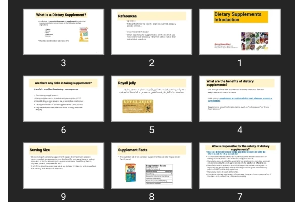 مشخصات فایل: پاورپوینت Dietary Supplements Introduction تعداد صفحات: ۲۶ فایل pptx می باشد. تعدادی از اسلایدهای ابتدایی با کیفیت بالاتر جهت مشاهده درج شده است.