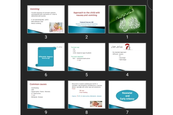 مشخصات فایل: پاورپوینت Approach to the child with nausea and vomiting تعداد صفحات: ۳۹ فایل ppt می باشد. تعدادی از اسلایدهای ابتدایی با کیفیت بالاتر جهت مشاهده درج شده است.