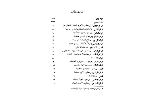 شامل: فی عجایب الاجرام العلویه فی عجایب الشمس فی ذکر الکواکب فی عجایب الارض البحار و الجبال فی عجایب الانهار و الجداول فی ذکر القبور و عجایبها فی علم الطب فی شرف العقل تقسیم الارواح اصناف و اجناس جن و...