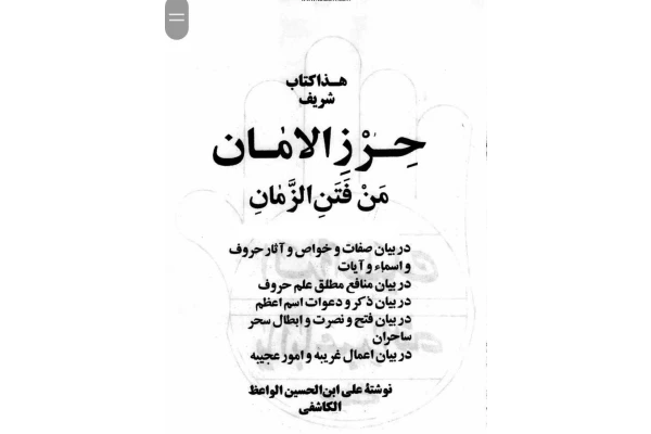 دانلود کتاب حِرْزِالامٰان مَنْ فَتَنِ الزَّمٰانِ #حرز_الامان نویسنده: علی ابن حسین واعظ کاشفی در بیان منافع مطلق علم حروف در بیان ذکر و دعوات اسم اعظم در بیان فتح، نصرت و ابطال سحر در بیان اعمال غریبه و امور عجیبیه در بیان صفات، خواص و آیات الهی در بیان خواص سوره های قرآن در بیان تسحیل رزق و دفع فقر در بیان ایمنی از تسخیر جن و انس اطلاع بر اسرار غیبیه و حصول مرادات ارواح و حقایق حروف و... می باشد.