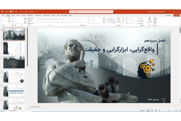 - تعداد اسلاید: 12 اسلاید محتوایی (تعداد اسلایدهای اعلامشده فقط شامل اسلایدهای محتوایی است و اسلایدهای مربوط به آیکونها و افزونهها جزو تعداد اصلی اسلایدها محاسبه نمیشوند.)