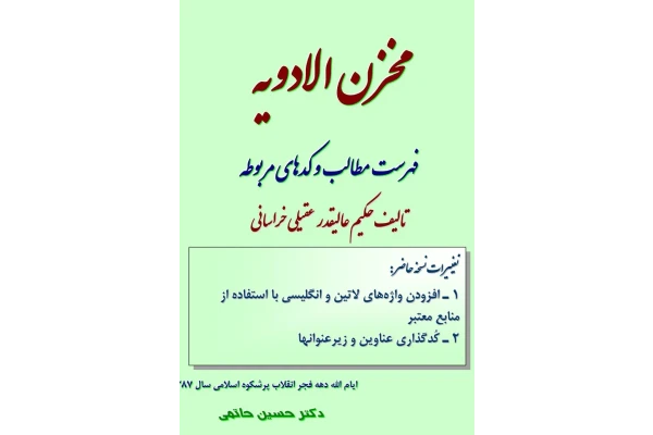 شامل: در بیان دوا و غذا در بیان مرکب القوی و ذوالخاصیه در بیان طریقه اخذ ادویه و حفظ آن در بیان آداب غذا خوردن و نوشیدن در بیان امور نجوم و طبیعیات در بیان مزاج و اقسام امزجه در بيان اصطلاحات طبيه متداوله در بيان احراق ادويه و تحميص و تشويه معرفت افعال و صفات ادويه مفرده و اسامی احراق عود هندی و...