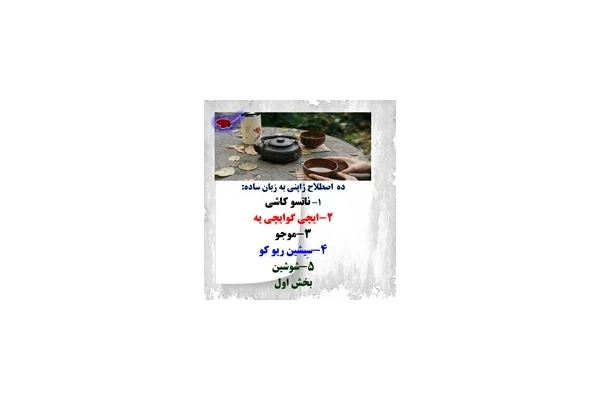 ده اصطلاح ژاپنی به زبان ساده: 1- ناتسو کاشی 2-ایچی گوایچی یه 3-موجو 4-سِیشین ریو کو 5-شوشین بخش اول پنج اصطلاح ژاپنی به زبان ساده: 1-ایکیگای 2-کایزن 3-نینتای 4-وابی سابی 5-یوتوری بخش دوم
