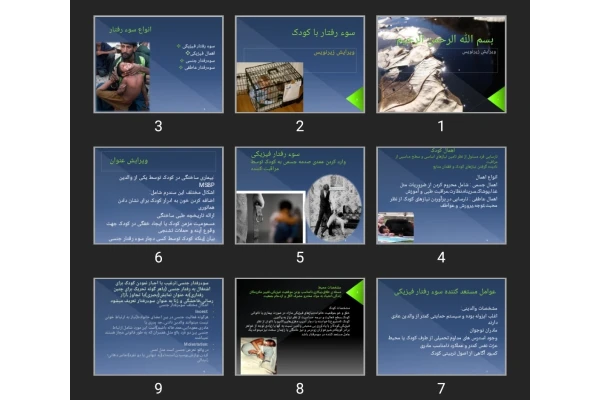 مشخصات فایل: پاورپوینتسوء رفتار با کودکتعداد صفحات: ۱۶فایل pptx می باشد.تعدادی از اسلایدهای ابتدایی با کیفیت بالاتر جهت مشاهده درج شده است.